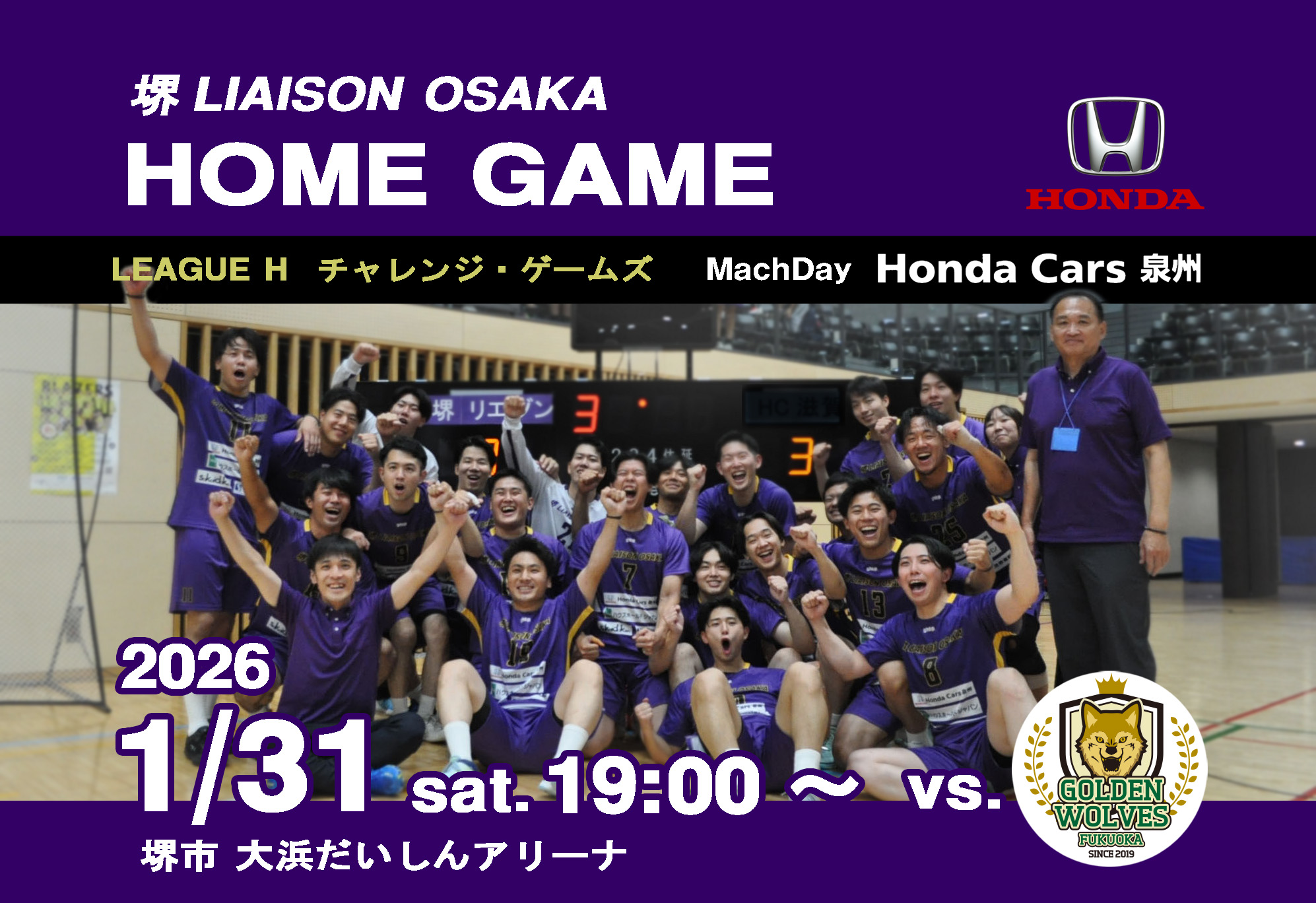 1/31(土)は、堺リエゾン大阪ホームゲーム(HondaCars泉州マッチデー)として、
